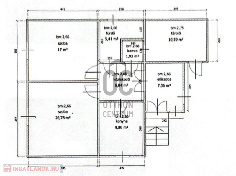 80 m2-es lakóingatlant, ( 2 szoba, konyha, fürdőszoba, előszoba, közlekedő, kamra található)