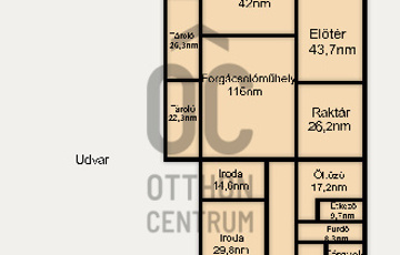 - Kiszolgáló helyiségek: raktár, tároló, iroda, tárgyaló, öltöző, fürdő és WC